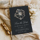 Notifique a los huéspedes de su próximo destino, playa o boda tropical con estos hermosos veranos, salve las tarjetas de cita con un falso ilustracion de flores de Relieve metalizado hibisco de oro sobre un rico y suave fondo negro. Elegante guión blanco y letras en bloques muestra los detalles de su boda (nombres, fecha de boda, ubicación y sitio web).