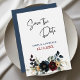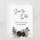 Elegante matrimonio floral azul polvoriento de la marina azul borgoña Save the Date. Anuncie su día especial con esta elegante boda floral azul polvoriento, marina y borgoña Salven la tarjeta de fecha. Con una sofisticada combinación de ricos arreglos florales y tonalidades atemporales, este diseño exuda romanticismo y encanto. El bonito diseño, combinado con una tipografía elegante, garantiza a sus huéspedes la marca de sus calendarios para una celebración inolvidable. Perfecto para otoño, invierno o cualquier tema boda clásico, este Save the Date establece el tono para un evento elegante y refinado.
