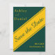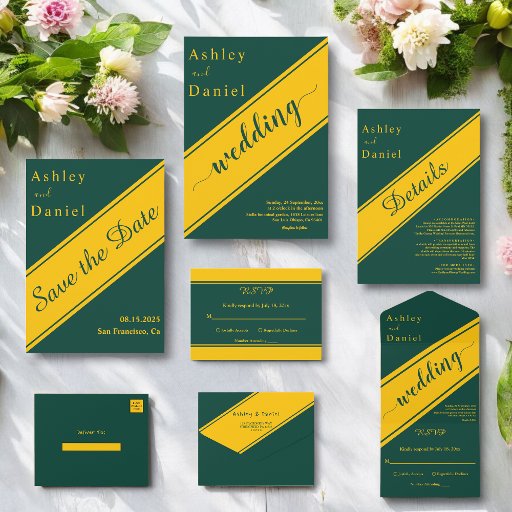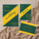 Esta elegante boda verde y dorada, en la que se ha guardado la fecha, es perfecta para un boda moderno. el diseño es sencillo, con una elegante caligrafía dorada sobre un fondo verde.