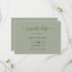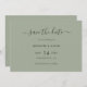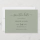 Anuncie su fiesta de bodas verde sabio con estas minimalistas y elegantes tarjetas de fecha. Personaliza fácilmente en línea. Los elementos de coincidencia disponibles para complementar esta boda guardan la tarjeta de fecha con un guión moderno.