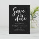 Esta elegante tarjeta de ahorro de la fecha boda en blanco y negro es perfecta para un boda moderno. El diseño es sencillo y cuenta con una elegante caligrafía blanca sobre un fondo negro. La tarjeta también incluye un código QR para el sitio web del boda en la parte posterior.