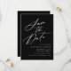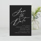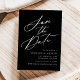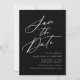 Elegante guardar la fecha con "Save the Date" mostrada en un guión de caligrafía blanca con fondo negro. Personalice la caligrafía y guarde la fecha con sus nombres, fecha y ubicación del boda y sitio web del boda. El diseño no fotográfico se coordina con nuestra colección de bodas de caligrafía elegante.