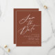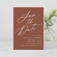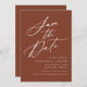Elegante guardar la fecha con "Save the Date" mostrada en un guión de caligrafía blanca con fondo de terracota. Personalice la caligrafía y guarde la fecha con sus nombres, fecha y ubicación del boda y sitio web del boda. El diseño no fotográfico se coordina con nuestra colección de bodas de caligrafía elegante.