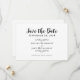 Elegantes y delicadas tarjetas de aviso de fecha de boda en sofisticado blanco y negro son clásicas, formales y atemporales. El diseño romántico sin bordes le permite elegir fácilmente la forma del papel para su anuncio de compromiso. Dos florituras decorativas que contienen un solo corazón envuelven delicadamente el nombre de la novia y el novio. Para obtener resultados óptimos, omita líneas y escriba con mayúsculas como en la muestra.