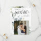 Esta invitación de guardar la fecha presenta arreglos de follaje de vegetación de acuarela elegante, hojas, hermosa caligrafía y fuente tipográfica serif simple con un marco de foto cuadrado sobre un fondo blanco y código QR para una apariencia limpia minimalista y moderna, que es una forma hermosa de informar sobre su próxima boda. Anuncie a su familia y amigos que se casarán con esta invitación y agregue un toque personal con hermosas fotos de usted y su futura mitad. La simplicidad de este diseño agrega un toque de elegancia a su boda. Funciona bien con muchos temas de boda y definitivamente es un gran complemento para su boda. Simplemente personalice los nombres y el texto en unos sencillos pasos y personalice la tarjeta de invitación con su foto de la feliz pareja y reemplace el código QR con el suyo.