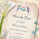 El elegante diseño floral del colibrí barroco cautiva el encanto del romanticismo eterno y la calidez de la artesanía mexicana. Esta tarjeta Save the Date boda presenta un intrincado marco barroco en tonos beige suave y champán, adornado con delicados rollos que evocan la elegancia europea antigua. En la parte superior, dos colibríes acuardan alrededor de un ramo de flores azules, corales y doradas vibrantes, que simbolizan la alegría, el amor y la armonía. El sutil entorno de los pergaminos realza el ambiente vintage, mientras que la refinada tipografía aporta un toque sofisticado para una boda formal o de destino. Perfecto para parejas que busquen una romántica boda vintage o una celebración inspirada en la elegancia del arte folclórico mexicano, este diseño combina a la perfección con invitaciones a juego, tarjetas RSVP y sobres de la misma colección. El detalle de la acuarela y la composición equilibrada hacen que esto Save the Date sea un placer para los huéspedes. Ya sea que esté planeando una ceremonia en el jardín, una hacienda boda o una elegante celebración costera, el Elegante Diseño Floral del Colibrí Barroco refleja arte, gracia y sincera belleza.