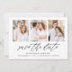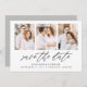 Anuncie sus próximas nupcias con estilo con nuestra elegante foto manuscrita guarde la tarjeta de fecha. El elegante guardar las tarjetas de fecha muestra 3 de tus fotos favoritas enmarcadas en blanco con "guardar la fecha" en un guión moderno y negro de caligrafía. Personalice la tarjeta agregando sus nombres, fecha de boda y ubicación del boda. El minimalista guardar la tarjeta de fecha se invierte a un fondo gris sólido o a un color de su elección.