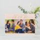 Estas modernas y elegantes bodas, que ahorran la fecha de las tarjetas de invitación, incluyen tres fotos de compromiso de 2 x 3" con la fecha que aparece en la escritura elegante. Personalice el texto de la plantilla de tarjeta en la parte delantera y trasera de la tarjeta para su gran día. El fondo rosado de color y el color de texto oro antiguo se pueden personalizar para coordinar con el esquema de color boda.