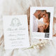 Anuncie su gran día con esta elegante boda de fotos verde salva la tarjeta de cita. La parte delantera muestra las iniciales del monograma de la pareja rodeadas por un escudo botánico de color verde salvia, con "Save the Date" elegantemente escrito en una caligrafía de fondo blanco. Personalice sus nombres, fecha de boda y ubicación del boda. En la parte posterior se muestra la foto de compromiso vertical junto con un escaneado código QR, lo que facilita a los huéspedes el acceso a su sitio web boda. Con un espacio para las instrucciones personalizados, este diseño combina encanto y sencillez, perfecto para bodas de jardín, exteriores e inspirados en la naturaleza.