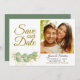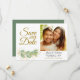 Elegante eucalipto Guardar la tarjeta de fecha con foto, nombres y fecha personalizado. La parte posterior es de color verde sabio, pero se puede cambiar a blanco u otro color antes de realizar el pedido.