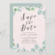 Moderno guardar la fecha con "Save the Date" mostrada en un guión de caligrafía gris oscuro con un fondo rosa claro. Una corona de hojas de eucalipto acuarela en múltiples tonos verdes rodea tus nombres, fecha boda, ubicación boda, etc. El eucalipto guarda la fecha se invierte para mostrar un fondo verde sabio con espacio para fotos y texto adicional.