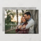 Una elegante boda ahorra la tarjeta postal de fecha diseñada para acomodar tu foto de compromiso horizontal o paisajista favorita de sangre completa. Sus nombres aparecen como un texto en blanco en escritura con letras a mano moderna. Personalice la fecha de boda y la ubicación del boda debajo. Las tarjetas cambian a un sutil patrón botánico con espacio para incluir la URL de su sitio web boda o cualquier información adicional que elija. Puede cambiar el color de fondo haciendo clic en Personalizar/Personalizar y, a continuación, seleccionando un nuevo color de fondo en la paleta o introduciendo un código hexadecimal de color.