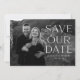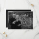 Moderno y elegante guardar los anuncios de fechas mostrando tu foto de compromiso horizontal favorita con "Save our Date" en un texto superpuesto apilado y blanco con una letra de anillo de diamante "o". Personalice la parte delantera de la foto para guardar la tarjeta de fecha agregando sus nombres, fecha de boda y ciudad/estado. La parte posterior de la tarjeta muestra un fondo negro sólido o cambia a un color de su elección.