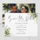 Esta elegante tarjeta de compromiso de boda con hojas de verde botánico se puede personalizar con su información en tipografía chic con su foto especial en el reverso. Diseñado por Thisisnotme©