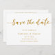 Esta elegante tarjeta blanca y dorada para guardar la fecha es perfecta para un boda moderno. El diseño es sencillo, con una elegante caligrafía dorada sobre un fondo blanco y limpio. La tarjeta también incluye un código QR para el sitio web del boda en la parte posterior.