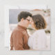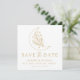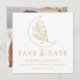 Anuncie su día especial con esta elegante foto de la Luna Botánica y las Estrellas para guardar la fecha. La tarjeta cuadrada muestra un ilustracion de arte de línea dorada de una luna creciente adornado con estrellas brillantes y follaje botánico sobre un fondo blanco. La caligrafía moderna elegante resalta los detalles, combinando el encanto celeste con un estilo sofisticado. En la parte trasera se muestra la foto de compromiso cuadrada de sangre completa, creando un keepsake personalizado para amigos y familiares.