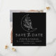 Invite a sus amigos y familiares a que salven su fecha de boda con esta elegante luna botánica y las estrellas para que no se olvide de la fecha. La cuadrada salva la tarjeta de fecha presenta un ilustracion de arte de línea blanca de una luna, adornado con estrellas brillantes y un frondoso follaje botánico, todo ello sobre un fondo negro. El diseño se realza con una caligrafía moderna sutil que añade un toque de sofisticación y estilo contemporáneo. La invitación se invierte para mostrar tu foto de compromiso cuadrada de sangre completa.
