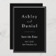 Esta elegante boda en blanco y negro le permite pasar la fecha y es perfecta para un boda moderno. el diseño sencillo presenta una elegante caligrafía blanca sobre un fondo negro.