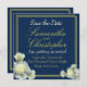 Reserva La Fecha Elegante Navy Blue Photo Gold Script Rosa Blanca