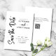 Esta exclusiva tarjeta Elegant Bold Script Black & White Formal Wedding Save the Date presenta una hermosa caligrafía de escritura vertical y tipografía moderna, y está totalmente en personalizable con sus nombres, detalles de bodas y un código QR para su sitio web boda. La temática clásica blanca y negra es perfecta para los bodas en cualquier temporada. Este elemento se coordina con la elegante suite Boda de guiones verticales en blanco negro.