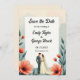 Esta elegante acuarela floral ahorra la invitación de la fecha es perfecta para un boda moderno. El diseño romántico presenta un marco floral de color agua elegante con un ilustracion de novia y novio y una caligrafía negra con un fondo blanco.