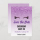 Fiesta guardar la tarjeta de fecha con un diseño moderno y elegante. El fondo es un color de gradiente morado con un purpurina chispeante que gotea desde la parte superior. Un par de pestañas lindas y niñitas debajo del purpurina.