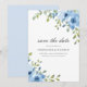 Flores de acuarela azul y vegetación modernas decoran esta elegante florida que salva la invitación de la fecha. Utilice las herramientas de plantilla en línea para cambiar el estilo de fuente, el color y el fondo a cualquiera de sus opciones.