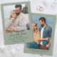 Tarjeta de aviso de boda minimalista simple. Este diseño presenta una distribución atemporal y versátil con un fondo verde salvia claro en ambos lados. Las fotos se muestran en la parte delantera y trasera, cada una con bordes redondeados para un toque elegante. La parte delantera muestra "Save the Date" en una mezcla elegante de fuentes script, serif y sans-serif simples, seguida de los nombres de la pareja, la fecha de la boda, la ciudad y el estado, lo que ofrece un estilo moderno pero clásico.