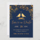 Anuncia tu boda con estas elegantes tarjetas de aviso de fecha de boda con flores doradas y pájaros en azul marino, que tienen un fondo azul oscuro adornado con un intrincado patrón de follaje floral dorado y tipografía moderna. La combinación del rico azul marino y el dorado brillante crea una estética elegante y lujosa. Inserta tu foto y el sitio web de tu boda en el reverso.