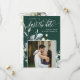 Esta invitación de guardar la fecha presenta arreglos elegantes de hojas de follaje de acuarela y hermosa caligrafía y fuente tipográfica serif simple con un marco de foto cuadrado en un fondo verde esmeralda y código QR para una apariencia limpia minimalista y moderna, que es una hermosa manera de informar sobre su próxima boda. Anuncie a su familia y amigos que se casarán con esta invitación y agregue un toque personal con hermosas fotos de usted y su futura mitad. La simplicidad de este diseño agrega un toque de elegancia a su boda. Funciona bien con muchos temas de boda y definitivamente es un gran complemento para su boda. Simplemente personalice los nombres y la redacción en unos sencillos pasos y personalice la tarjeta de invitación con su foto de la feliz pareja y reemplace el código QR con el suyo.