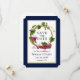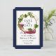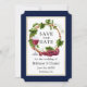 Tarjeta de Anuncio de Boda con Corona de Madera de Uvas y Vides en Aquarela - Fondo Azul con Marco Dorado.