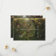 Beautiful enchanted forest with large, tall old trees, forest floor has flowers and moss. Pretty pink, turquoise and blue butterflies, gold glitter string lights, save the date cards.