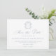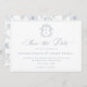 Dusty Blue Monogram Escudo, la boda salva la fecha. Escudo de monograma de arte de línea barroca Regency-Era de inspiración vintage. Características, una elegante tipografía azul polvorienta estilo mezcla de guión y negrita. El estilo de jardín estilo Chinoiserie se basa en el código QR.