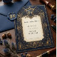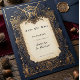 Haga un gran anuncio con esta tarjeta de "Guarde la fecha", una fusión perfecta de la heráldica medieval y el encanto celestial. La paleta de colores de un profundo azul marino y dorado opulento crea un ambiente lujoso y sofisticado, mientras que el escudo central con espadas cruzadas y florituras ornamentadas evoca un sentido de elegancia atemporal. Adornada con sutiles motivos celestes y adornos florales detallados, esta tarjeta está diseñada para impresionar. Es una forma inolvidable de informar a sus invitados sobre la fecha de su boda, preparando el escenario para una celebración llena de romance y encanto histórico.