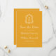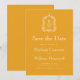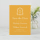 Esta elegante boda de inspiración vintage Save the Date presenta un par de iniciales en monograma blanco con una fuente serif abierta encima y debajo de una línea divisoria y rodeada por una línea de arte acanthus escudo sobre un fondo amarillo caléndulo. El dorso de la carta es de oro sólido.