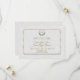 ¡Símbolo de elegancia, abundancia y ostentación! Diseño único de cartas con un escudo de Relieve metalizado de oro real, un marco delicado, ramas de olivo con una flor blanca sobre un fondo de textura blanca. Utilice la herramienta Personalizar para agregar su información. Para ver los artículos que coincidan, por favor, visite mi Colección Real de Bodas de Escudo de Oro exuberante.
