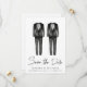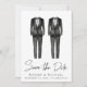 Anuncio de boda gay elegante y chic para guardar la fecha con dos esmoquin de acuarela y "Guardar la fecha" en una tipografía estilizada. Agregue sus nombres, fecha de la boda y ubicación en tipografía moderna. Personalice con sus detalles en el reverso.
