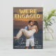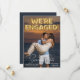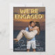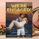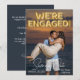 Este Save the Date para el anuncio de la boda presenta un diseño divertido y romántico. Una fotografía de muestra del compromiso cubre el fondo, que puede reemplazar con su propia foto personalizada u otra imagen de su elección. La frase, "estamos comprometidos" está impresa en globos de papel de aluminio dorado en la parte superior. La ubicación y el día de "Guarde nuestra fecha" están impresos en la parte inferior en una fuente blanca elegante, con texto adicional impreso en el reverso del anuncio.