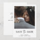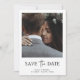 Esta sencilla y elegante tarjeta de save the date de boda en blanco y negro presenta su foto personal en la parte frontal, con una mezcla de texto manuscrito moderno y texto serif negrita. Hay espacio para información adicional en la parte posterior, incluyendo su sitio web de boda.