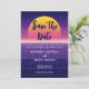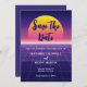 Esta boda retro de los años 80 Save the Date presenta arte de sintetización fresco, violeta y una puesta de sol sobre las líneas de neón. Esta increíble tarjeta temática de 80 años de retroceso es atrevida y divertida, seguro que atrapará la atención de cualquiera y les hará saber que estás haciendo una fiesta de bodas de rockin.