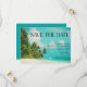 Fechas de guardado de boda con aguas azules tropicales y escena de playa con palmeras para su boda de destino, isla o playa. Personalice con sus nombres, fecha de boda y ubicación. Contácteme usando el botón de abajo si necesita ayuda o desea agregar su foto al reverso de esta tarjeta.