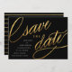 Estas fechas de guardado únicas y modernas presentan una tipografía elegante con un efecto de lámina dorada falsa sobre un fondo negro, con los detalles del anuncio de la boda en blanco. La parte posterior presenta un patrón de rayas negras y doradas de moda.