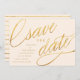Estas fechas únicas y modernas para guardar presentan una escritura elegante con un efecto de lámina de oro falso en un fondo de color champán dulce, con los detalles del anuncio de la boda en blanco. La parte posterior presenta un patrón de franja dorada de moda. ¡Cambia el color de fondo usando la herramienta "Personalizar"!