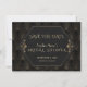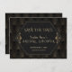 Diseño de tarjeta de boda Royal Gold Black Great Gatsby. Diseño de tarjeta real, romántico y vintage con un estilo art déco de Great Gatsby, un antiguo Hollywood de los años 20 rugientes, con superposición de Fleur-de-lis de lámina de oro falsa, divisor y fuentes hermosas, sobre un fondo de patrón texturizado negro. Utilice la herramienta Personalizar para agregar su información. Para más, visite por favor, mi encantadora colección Art Déco de Great Gatsby. La década de 1920 fue un momento de prohibición, gánsteres, fiestas clandestinas, música jazz y chicas flapper.