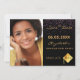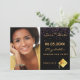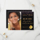 En el frente: agregue su propia foto de tamaño vertical del graduado. Un elegante color de fondo negro y un rociado de confeti morado. Plantillas para un nombre y fecha. Letras doradas. El nombre y el texto: Guarde la fecha están escritos con un estilo de letra manuscrita moderno. Con una tapa abstracta moderna de oro falso, tope de borla.
