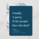 Finalmente un Fiesta de texto simple Marina azul Minimalista Guardar la fecha. Un diseño sencillo y moderno resalta este texto editable en color. Finalmente. Un fiesta. Con la gente. Reserva la fecha! Con una textura de mármol de bonito en la parte trasera, pero que puede ser reemplazada por tu propia foto. ~ Revisa mi tienda para ver toda la suite boda para este diseño!