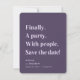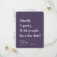 Finalmente un Fiesta Texto simple Púrpura Minimalista Guardar la fecha. Un diseño sencillo y moderno resalta esta tipografía editable en color. Finalmente. Un fiesta. Con la gente. Reserva la fecha! Con una textura de mármol de bonito en la parte trasera, pero que puede ser reemplazada por tu propia foto. ~ Revisa mi tienda para ver toda la suite boda para este diseño!