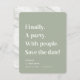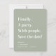 Finalmente un Fiesta Sage de texto simple Verde Minimalista Guardar la fecha. Un diseño sencillo y moderno resalta esta tipografía editable en color. Finalmente. Un fiesta. Con la gente. Reserva la fecha! Con una textura de mármol de bonito en la parte trasera, pero que puede ser reemplazada por tu propia foto. ~ Revisa mi tienda para ver toda la suite boda para este diseño!