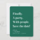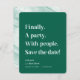 Finalmente un Fiesta de texto simple verde esmeralda Minimalista Salven la fecha. Un diseño sencillo y moderno resalta esta tipografía editable en color. Finalmente. Un fiesta. Con la gente. Reserva la fecha! Con una textura de mármol de bonito en la parte trasera, pero que puede ser reemplazada por tu propia foto. ~ Revisa mi tienda para ver toda la suite boda para este diseño!