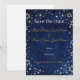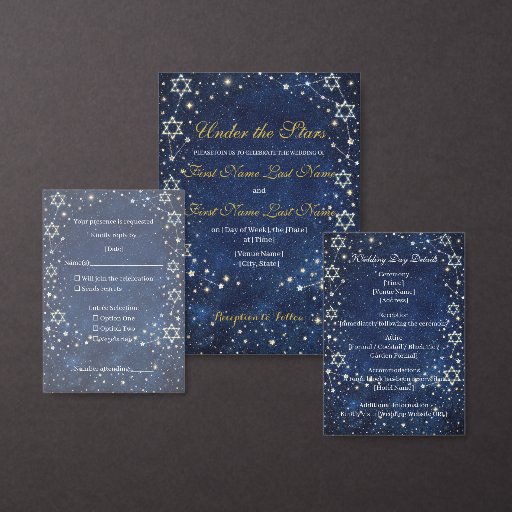 Announce your special day beneath the stars. This Save the Date card showcases a dreamy navy sky dusted with golden starlight and softly glowing Star of David constellations. Romantic and refined, it sets the tone for a magical evening celebration while offering guests a beautiful first glimpse of your celestial wedding theme.